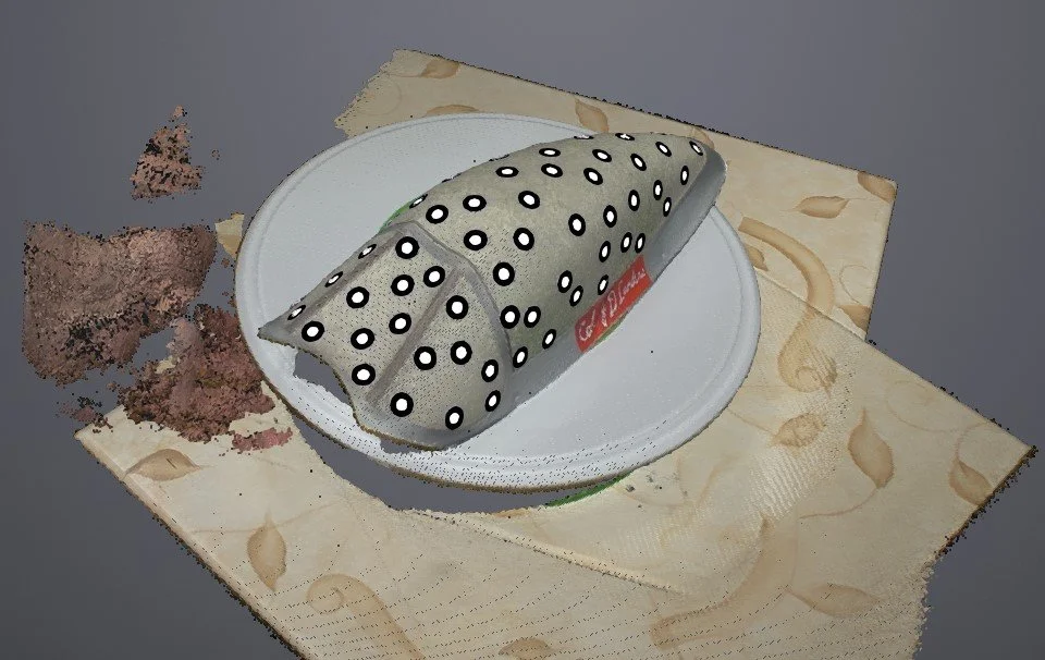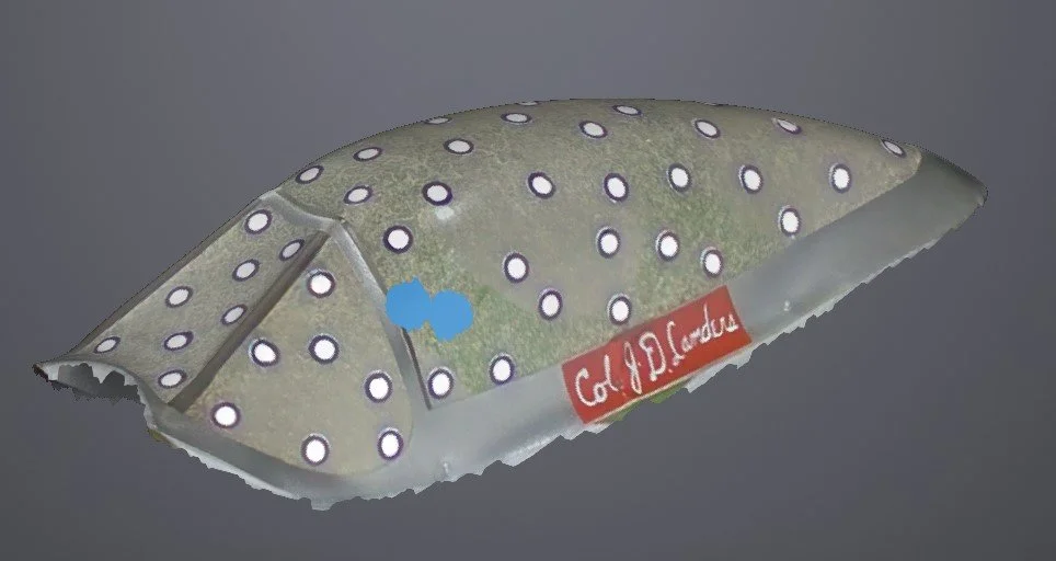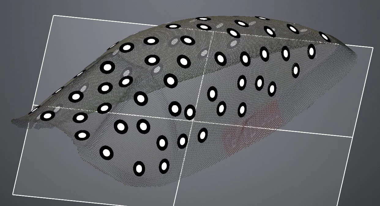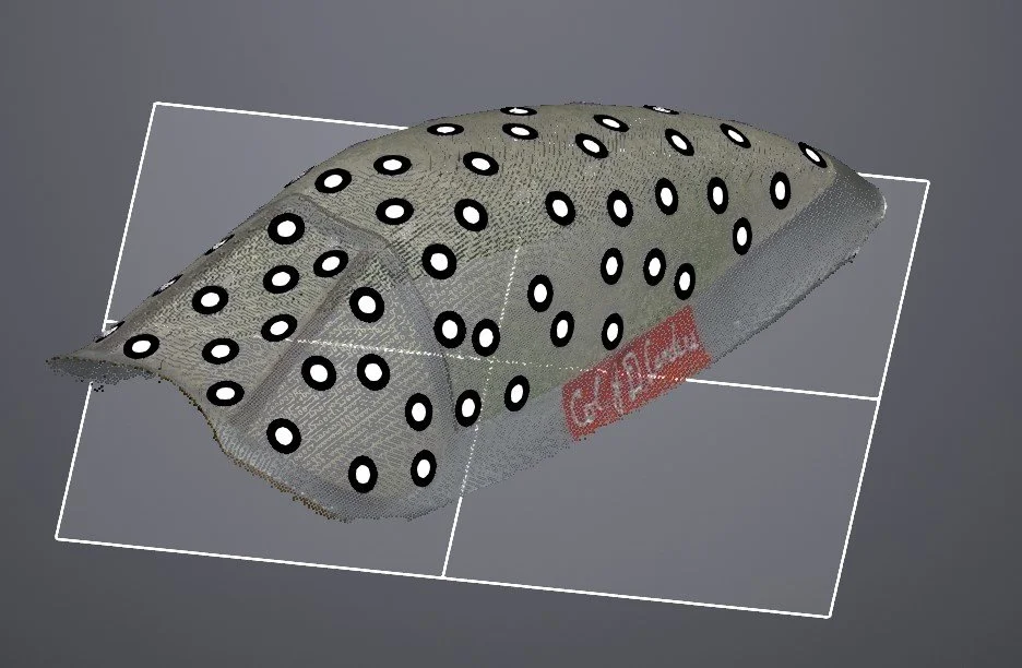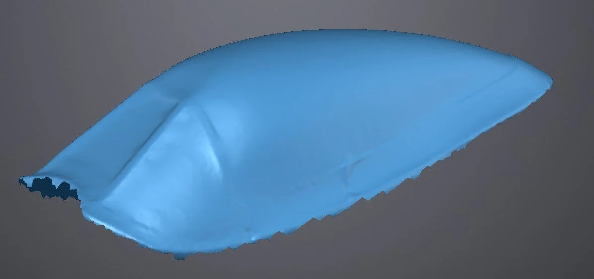 The software will convert, through various filter selections, the point cloud into a triangular mesh. Patches can easily be applied manually. In this case with the surface texture mapping. Ready for use in other CAD packages.